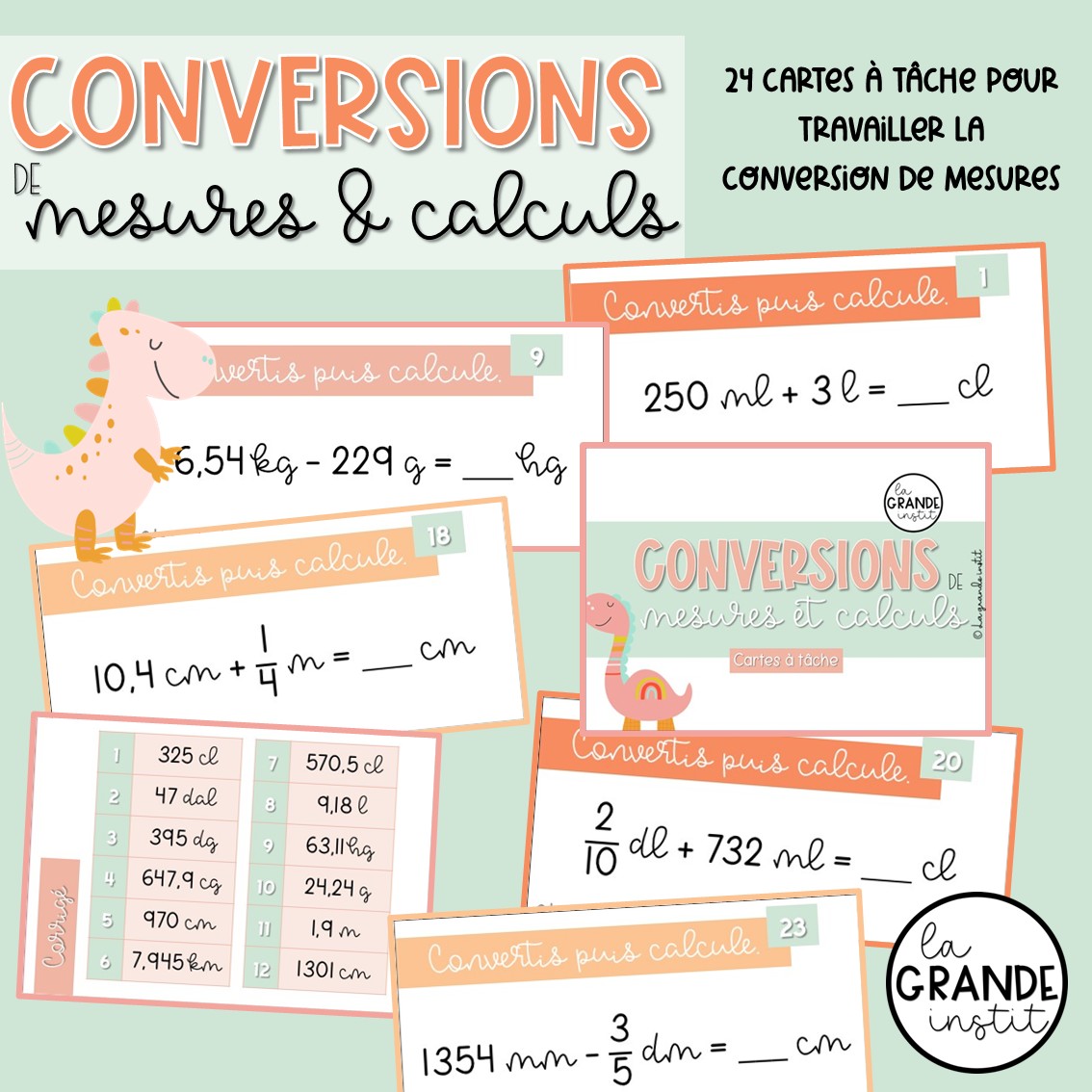 Voici un ensemble de 24 cartes à tâches pour travailler la conversion de mesure (le rapport 10) et le calcul. L’enfant doit d’abord convertir les mesures et ensuite trouver la réponse dans l’unité demandée. L’ensemble travaille la conversion de masses, de longueurs et de capacités.