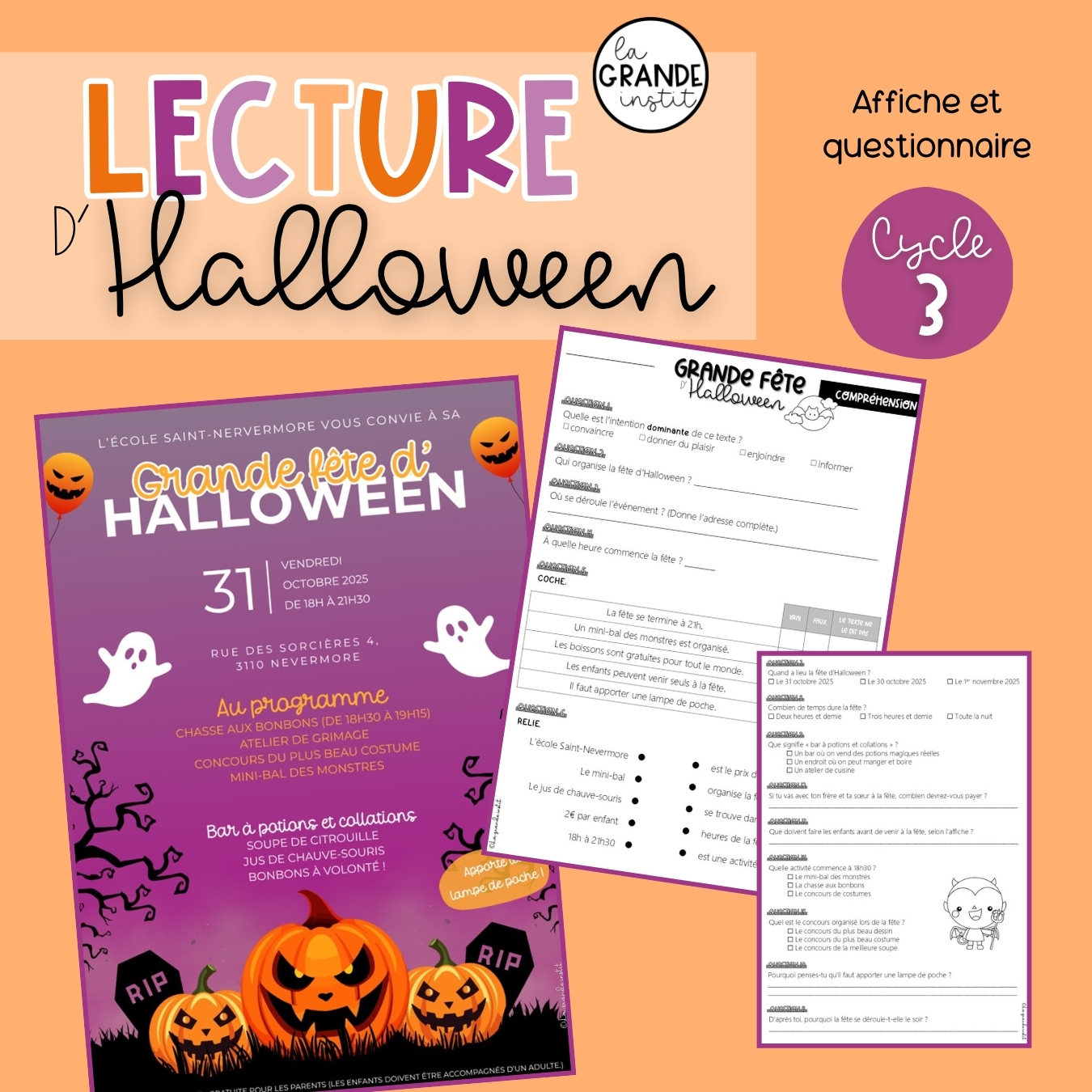 Je vous partage une compréhension à la lecture d’une AFFICHE sur le thème d’Halloween idéale pour des élèves de 3e et 4e primaire. Vous trouverez des questions de compréhension et le corrigé est fourni !
