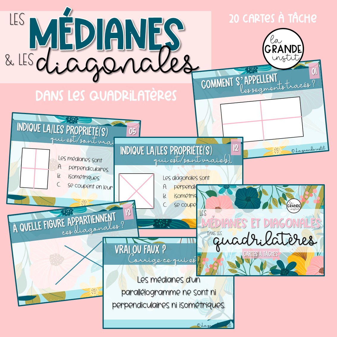 Voici un ensemble de 20 cartes à tâche pour revoir les notions de diagonales et de médianes dans les quadrilatères. Elles permettent de revoir les propriétés de ces dernières dans les quadrilatères.