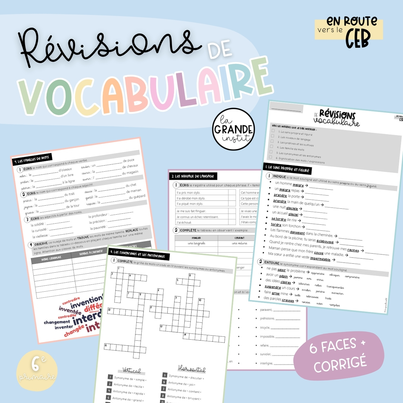 Retrouvez un fichier de révisions de vocabulaire, 6 pages et corrigé inclus. Tous les exercices sont exclusifs, créés par mes soins. Il ne s’agit donc pas d’exercices des anciens CEB, mais ils restent dans le même esprit afin de préparer les élèves au mieux.